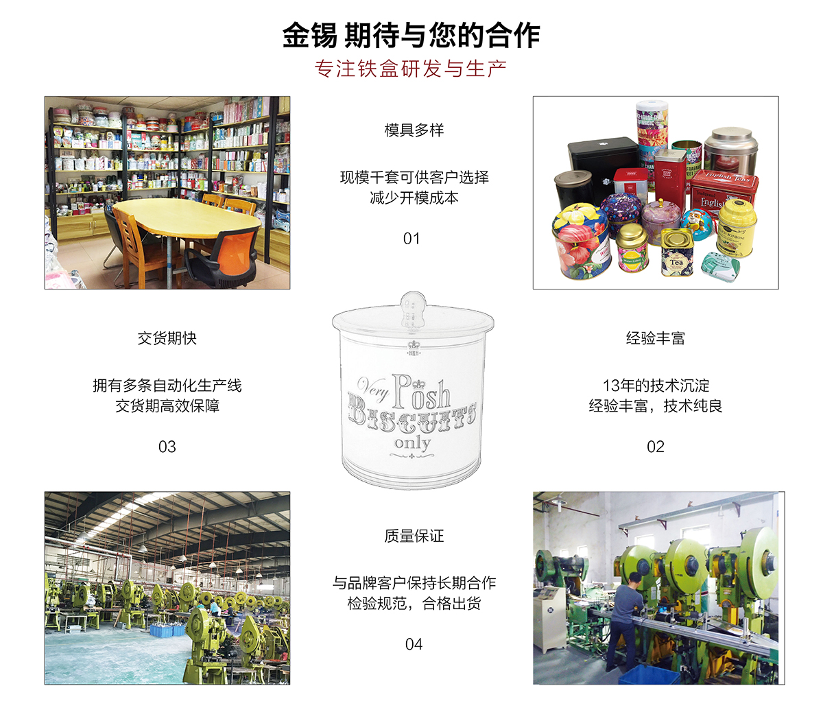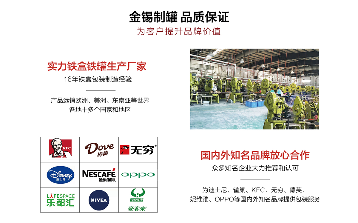 廣州市金錫五金制品有限公司成立于2016年,是已有13年生產經驗的實力廠家。我廠是專業定制優(yōu)良馬口鐵盒、鐵罐、禮品盒、茶葉罐、月餅盒等金屬鐵盒包裝的制罐企業,我們擁有超過6000平方米的標準現代化廠房及八條生產線。公司集產品研發(fā)、設計、生產、銷售于一體,技術優(yōu)良,實力雄厚。通過十多年的制罐經驗,我們擁有專業的技術團隊,嚴格的作業流程、完整的品質保障體系、完善的銷售以及售后服務系統。